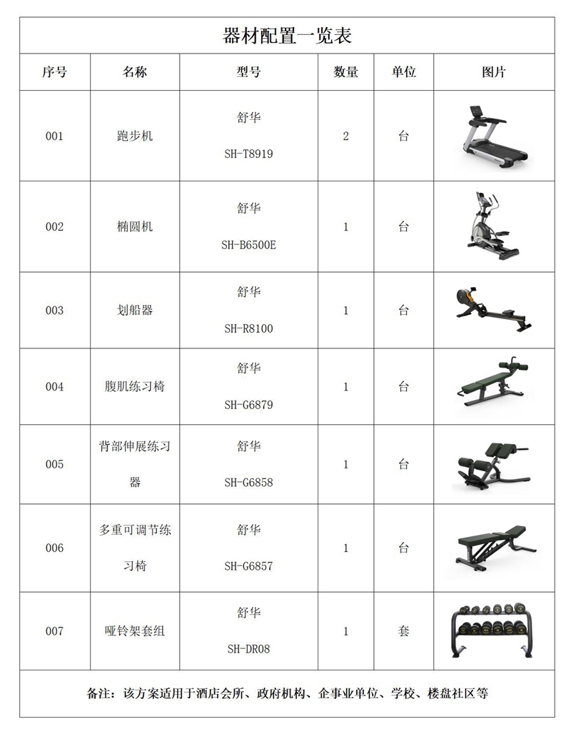 此方案要求面积小于60平米,我们会根据您个人的实际情况和场地面积而定。此方案推荐小型健身工作室、单位健身房、酒店会所健身房、配置。能满足5-10人同时健身使用。